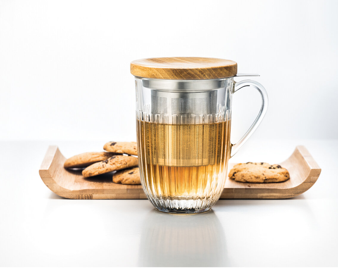 Material: Mugg av pressglas. Sil av rostfritt stål. Lock av bambu.