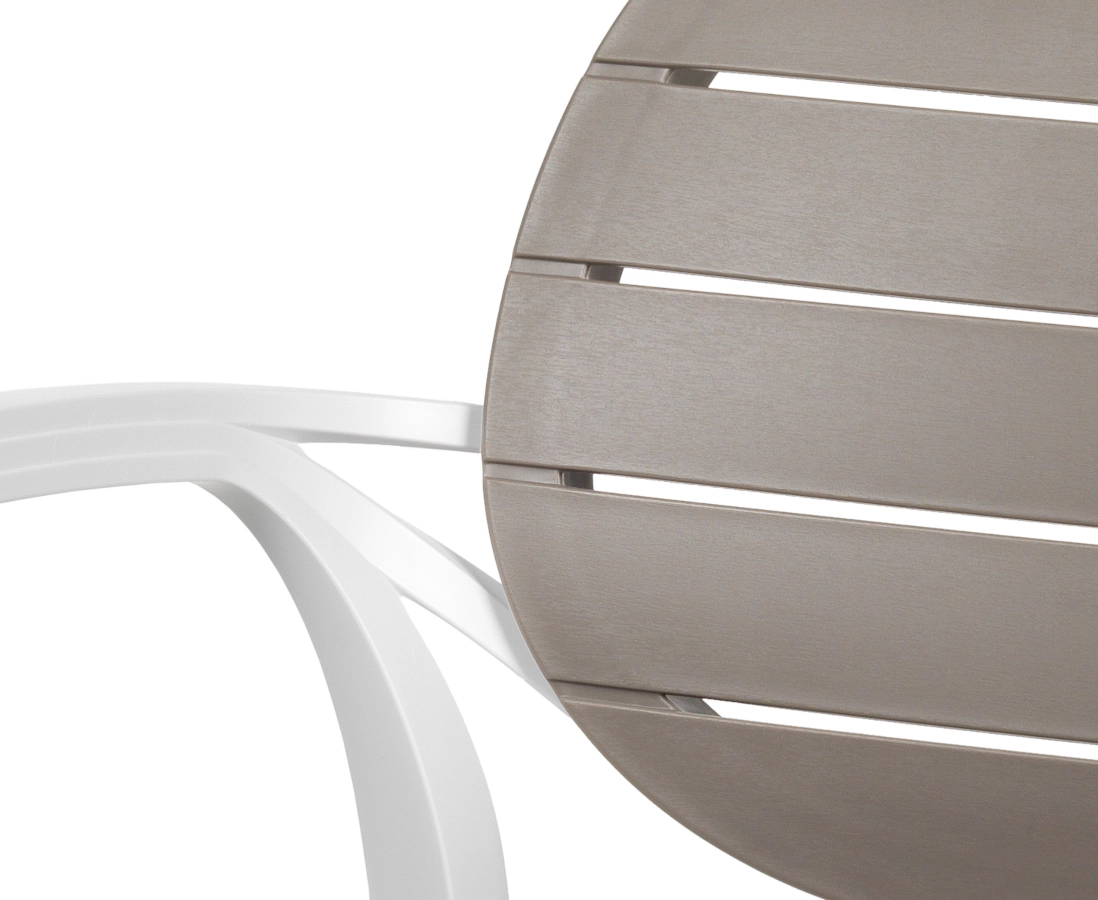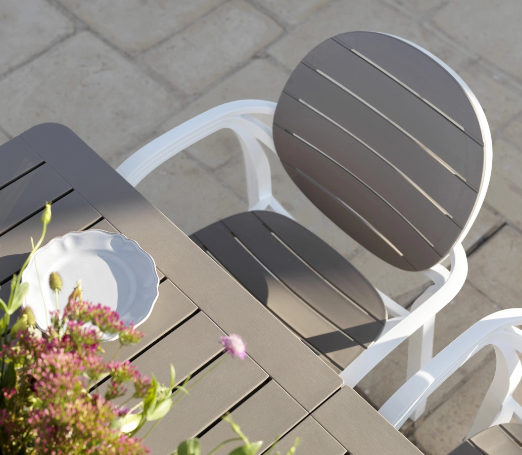Med armstöden på karmstolen får man extra sittkomfort och det är en stol som passar bra som restaurangstol, kafestol eller som matstol på en uteservering men även intressant vid en mer privat utomhusmiljö.
