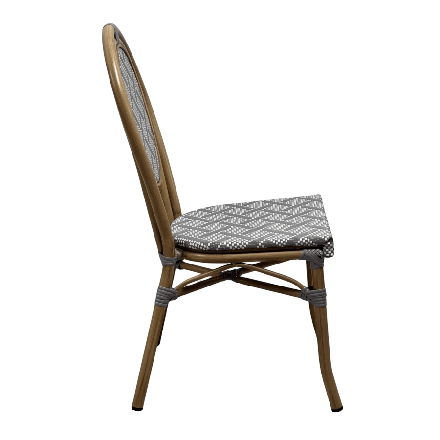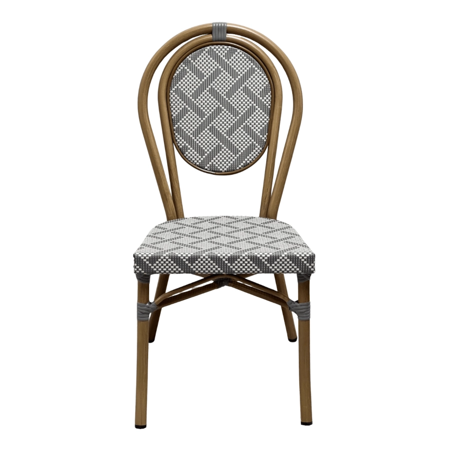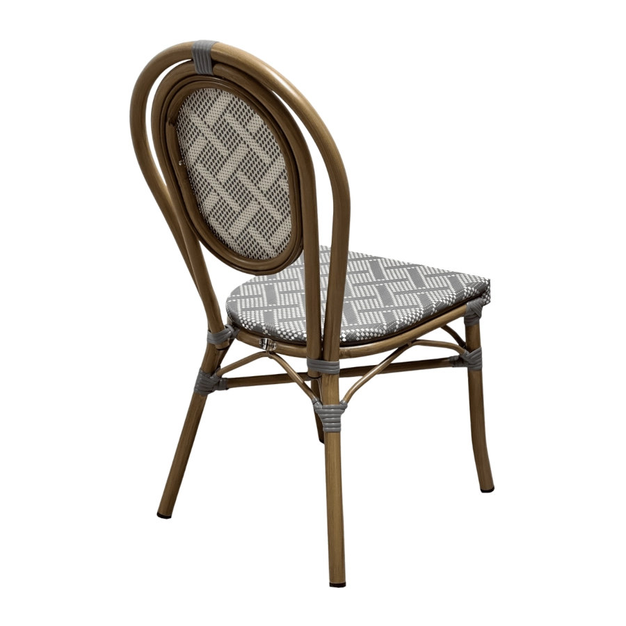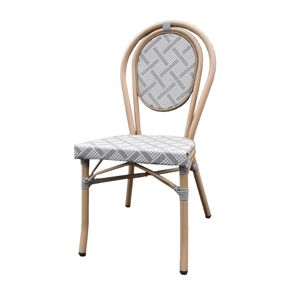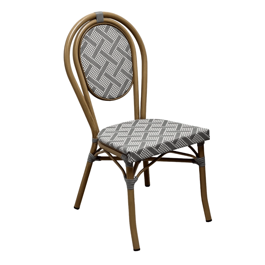Paris 1 stol med mönstrad grå textilene och stomme i ljus träfärg som har bistrostil som passar bra på flera olika uteserveringar och uteplatser.