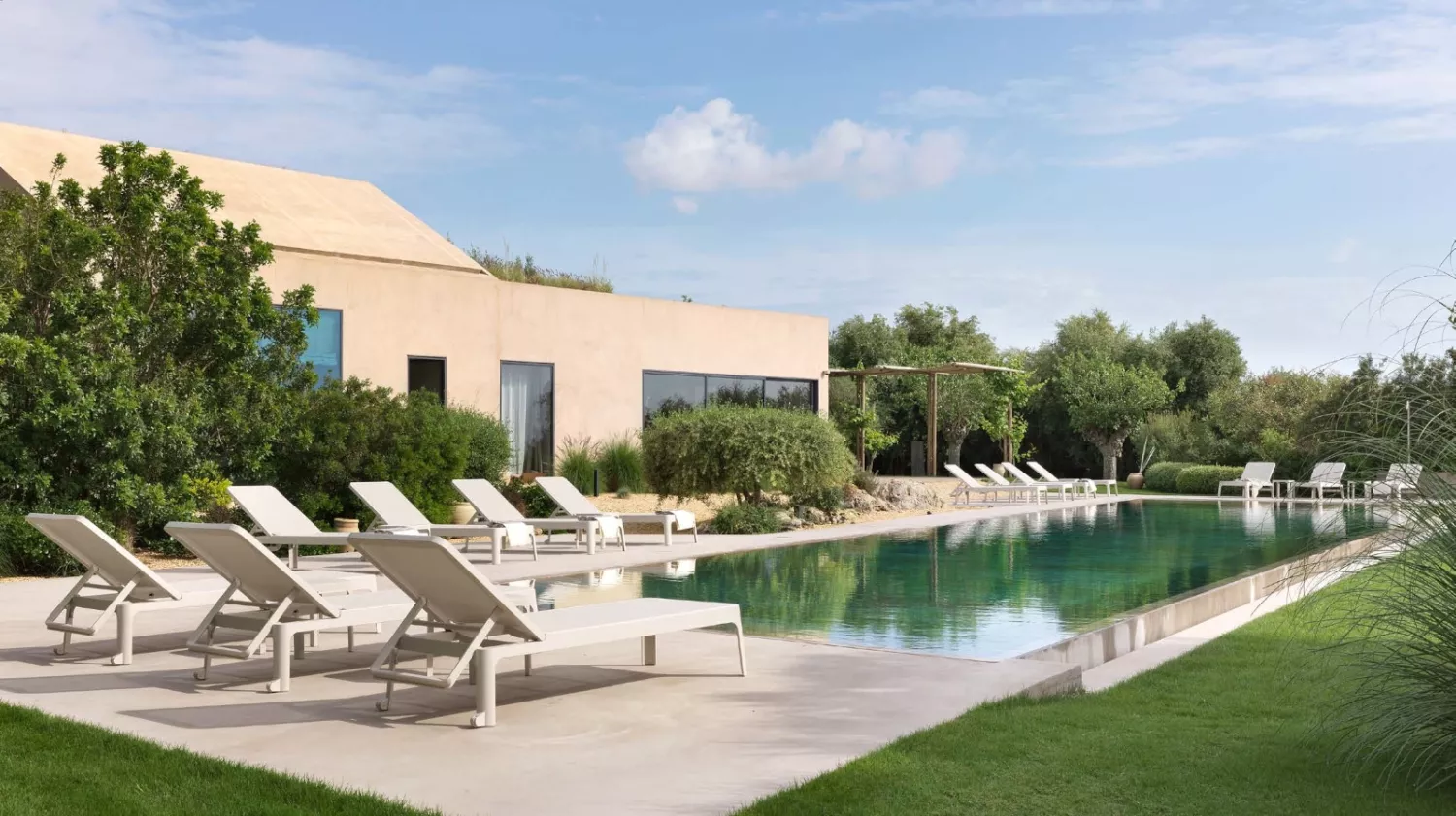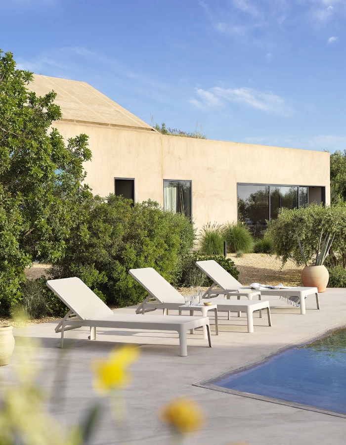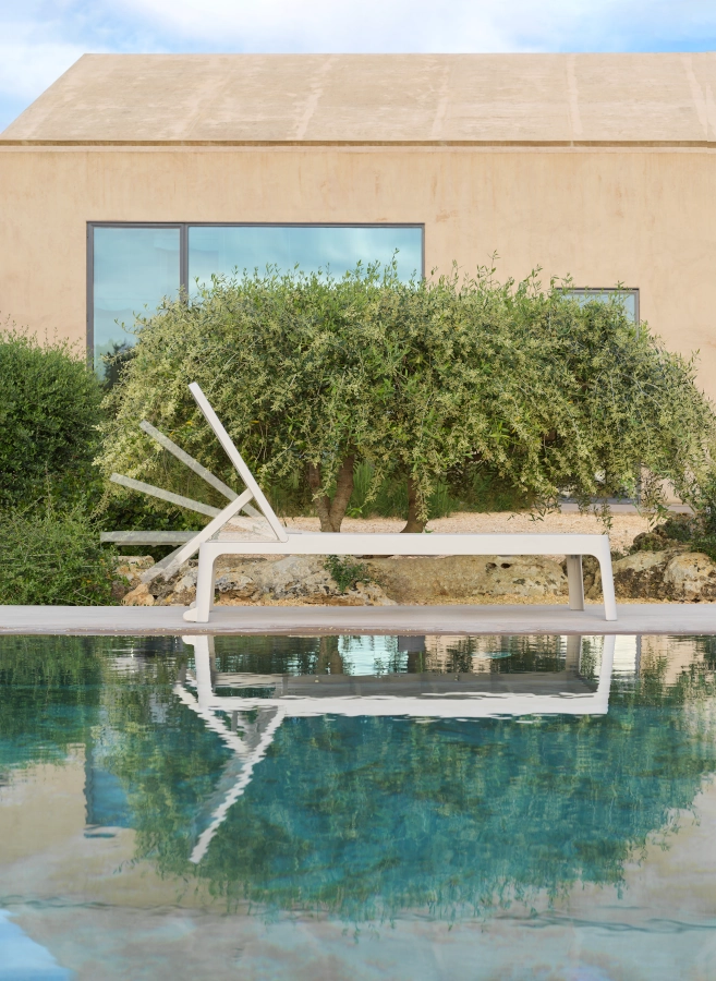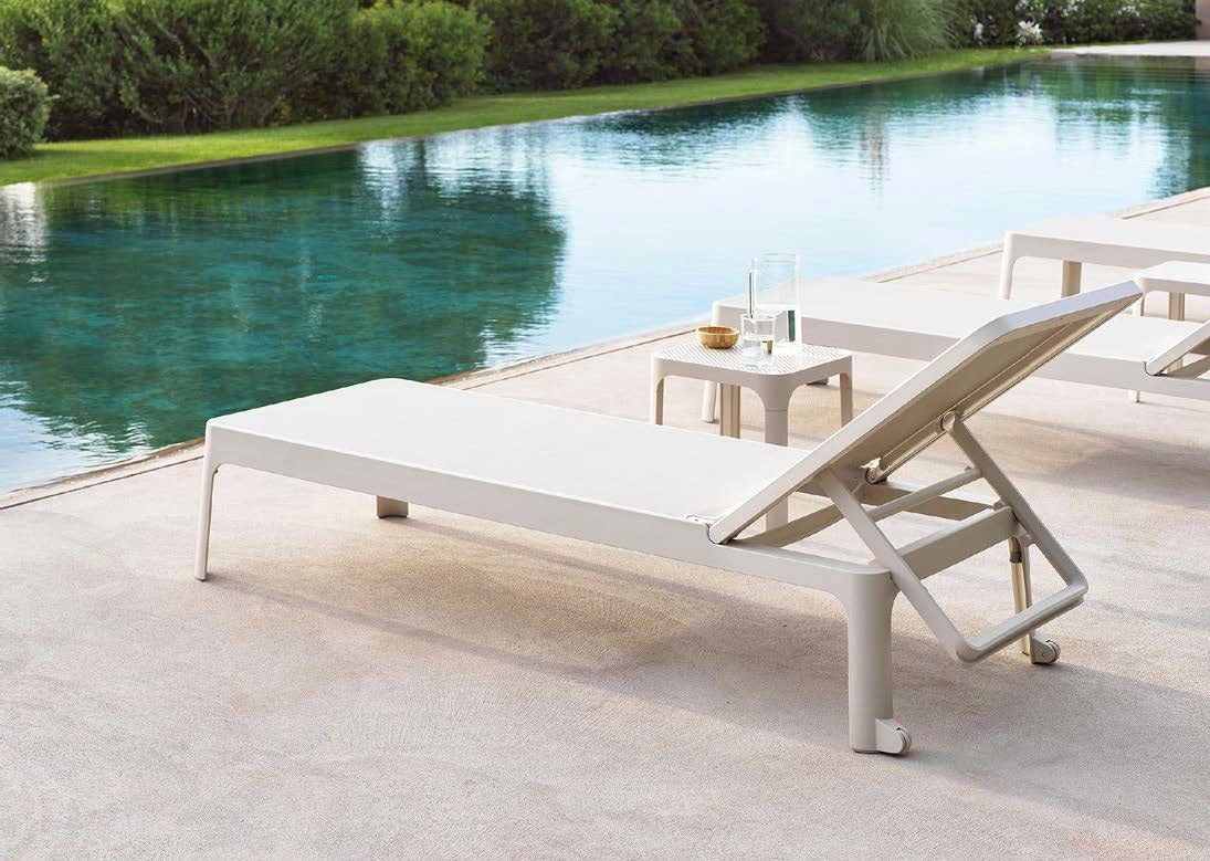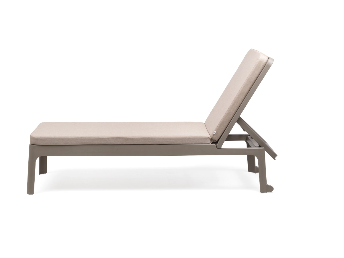Plano solsäng av polypropylen med syntetväv som har stilren design och ställbar rygg i olika lägen som passar bra i olika miljöer.
