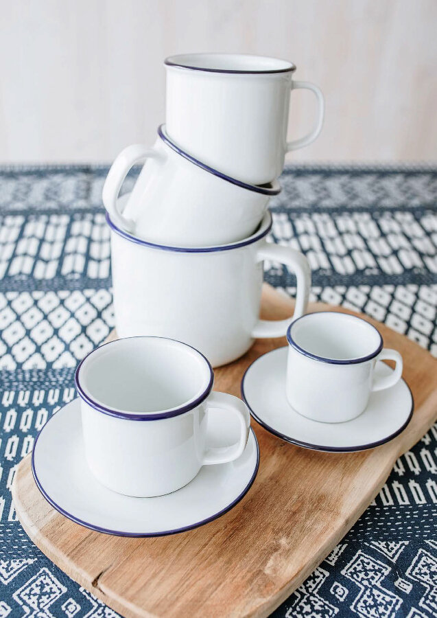 En serie som har en design som för tankar till klassiska muggar i emaljerat utförande men här är de av porslin. Serien Retro med dekoren "Blå kant" innehåller muggar men även kaffekopp och espressokopp som har tillhörande fat.