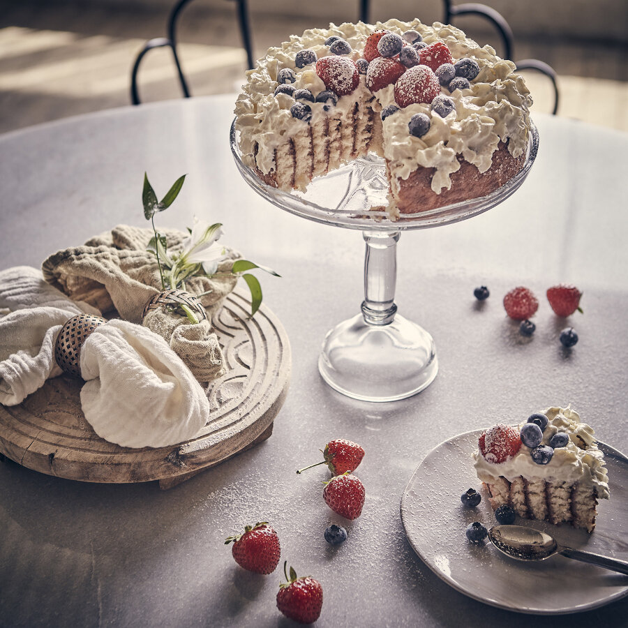 Det här fatet har en kant och fatet passar bra som kakfat, tårtfat och som serveringsfat vid servering och presentation av olika godsaker.