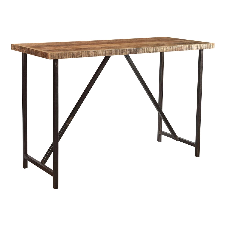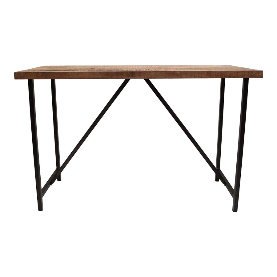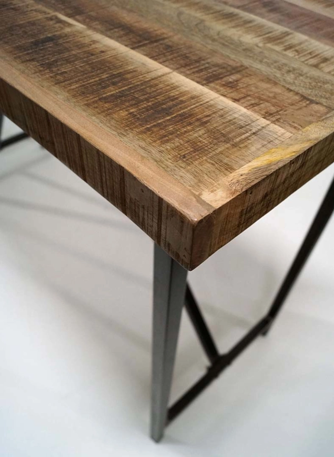 Ryan barbord har bordsskiva av mangoträ med ojämn yta som har ett rustikt utseende och stativ med snedställda delar. De snedställda delarna gör att bordet blir stabilt men ger även ett snyggt utseende till bordet.