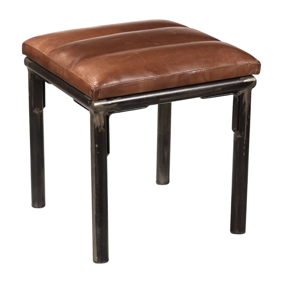 Sean pall med fyrkantig form som är robust och har ett rustikt utseende. Pallen har vacker sits i brunt läder och stativ med patinerad industristil med sin klarlack. Den här pallen ingår även i en serie där det även finns en bänk.