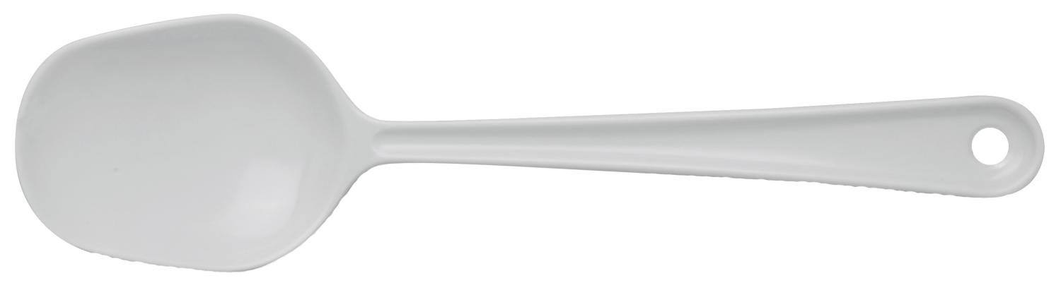 Serveringssked som är tillverkad av melamin i vit färg. En serveringssked som ingår i en serie där olika storlekar och färger finns. Serveringssked som har ett praktiskt hål för enkel upphängning.