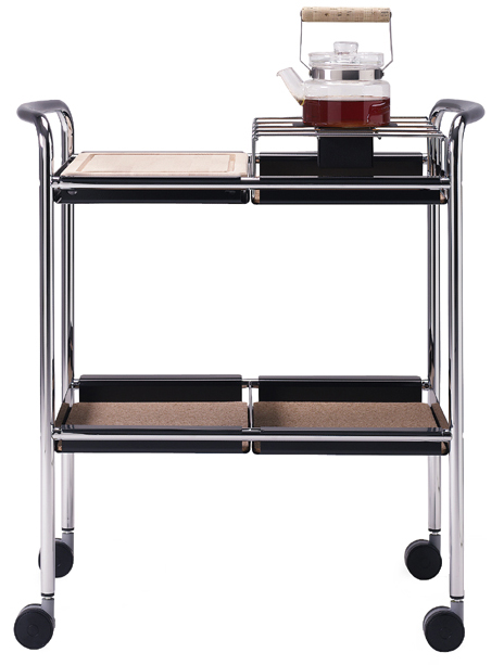 Supporter är en stabil serveringsvagn i matbordshöjd som har 4 avtagbara brickor i svart plåt med lösa korkskivor som glidskydd. Vagnen har även stadiga hjul som gör att serveringsvagnen rullar lätt. Det finns en lös skärbräda av massiv bok och ett kombinerat vin/värmeställ som kompletterar serveringsvagnen.