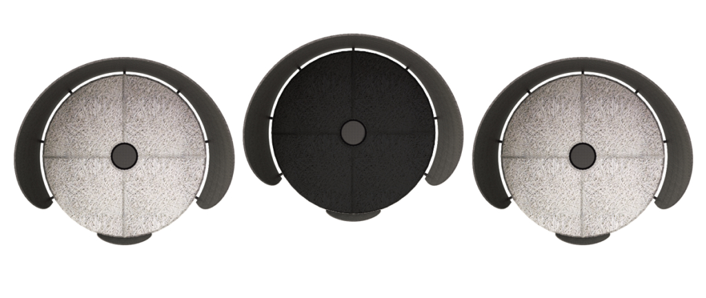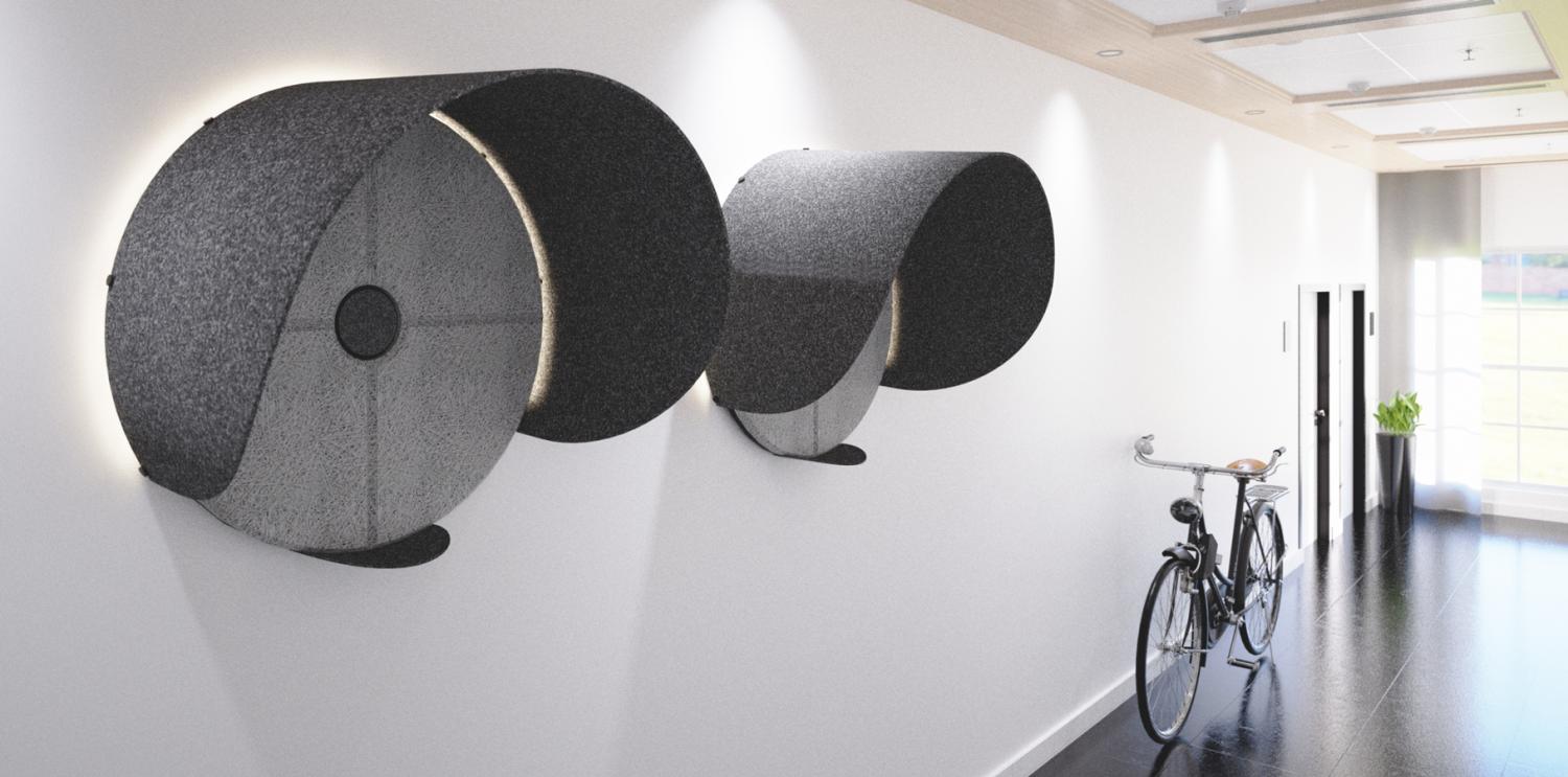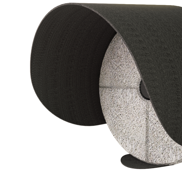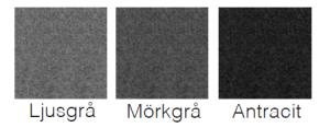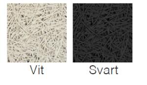 Material: Ljudabsorberande träfiberplatta och fiberskärm. Hylla av metall med fiber.