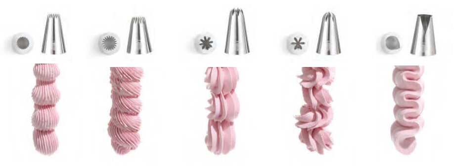 Tyllar som är tillverkade av rostfritt 18/10 stål och som har olika öppningar. I denna förpackning finns 2 med olika stjärn öppningar, 1 med blom öppning, 1 med fransk stjärn öppning och 1 v-formad.