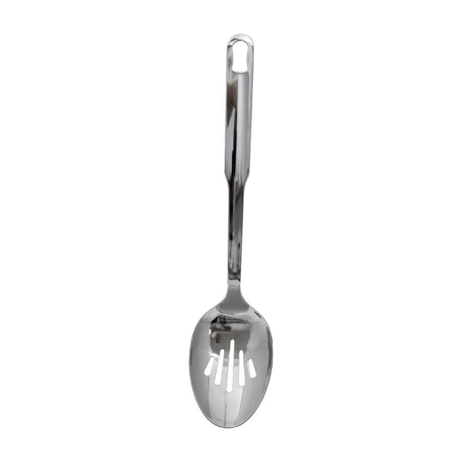 Uppläggningssked med slitsade hål i rostfritt som är tålig, praktisk och enkel att rengöra. Skeden ingår även i en serie där olika köksredskap finns som kan användas ihop eller var för sig. I serien kan man även se en variant av denna uppläggningssked som inte har slitsade hål.