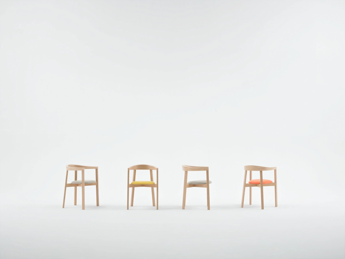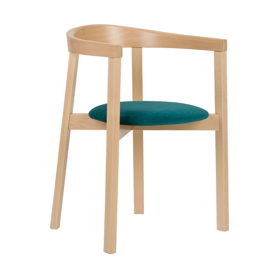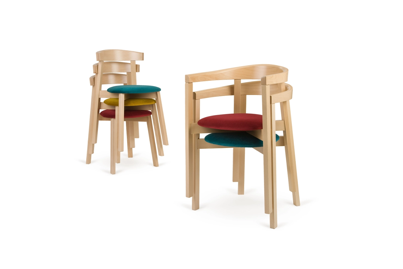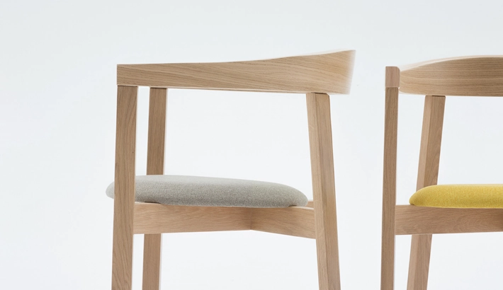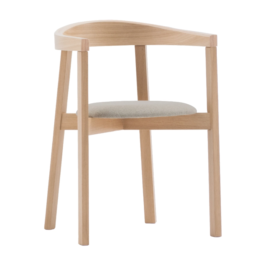 Uxi karmstol som är tillverkad av bok med klädd sits och som har en tidlös design. Karmstolen ingår i serien Uxi där det även finns en stol och en barstol som kan användas ihop eller var för sig i olika miljöer.
