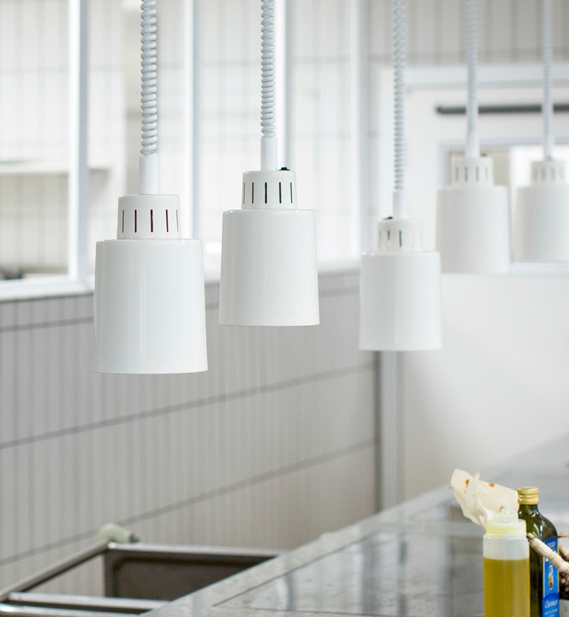 Värmelampa Compact i vitfärg är höj och sänkbar med hissfunktion som är tillverkad av aluminium.