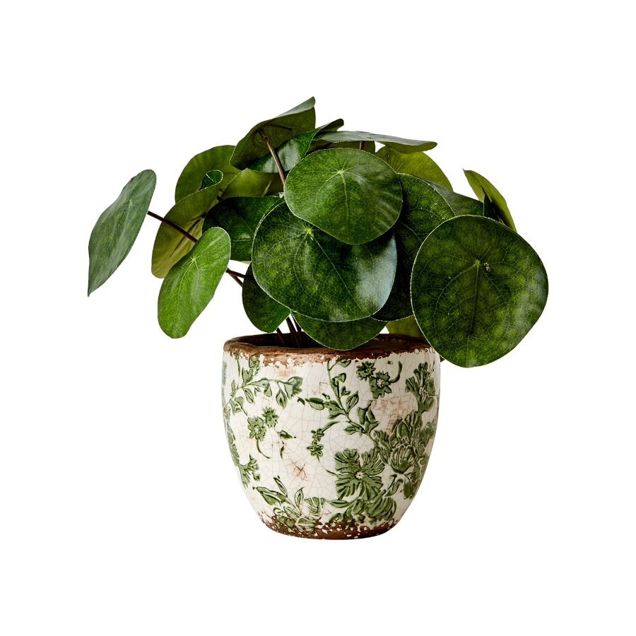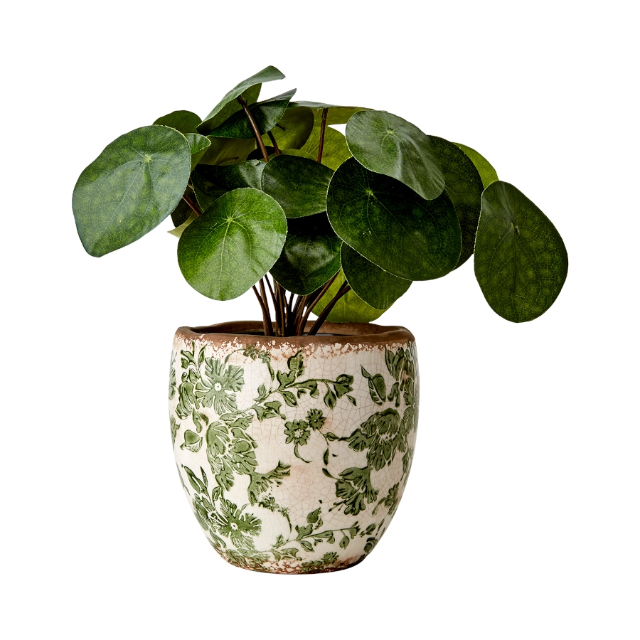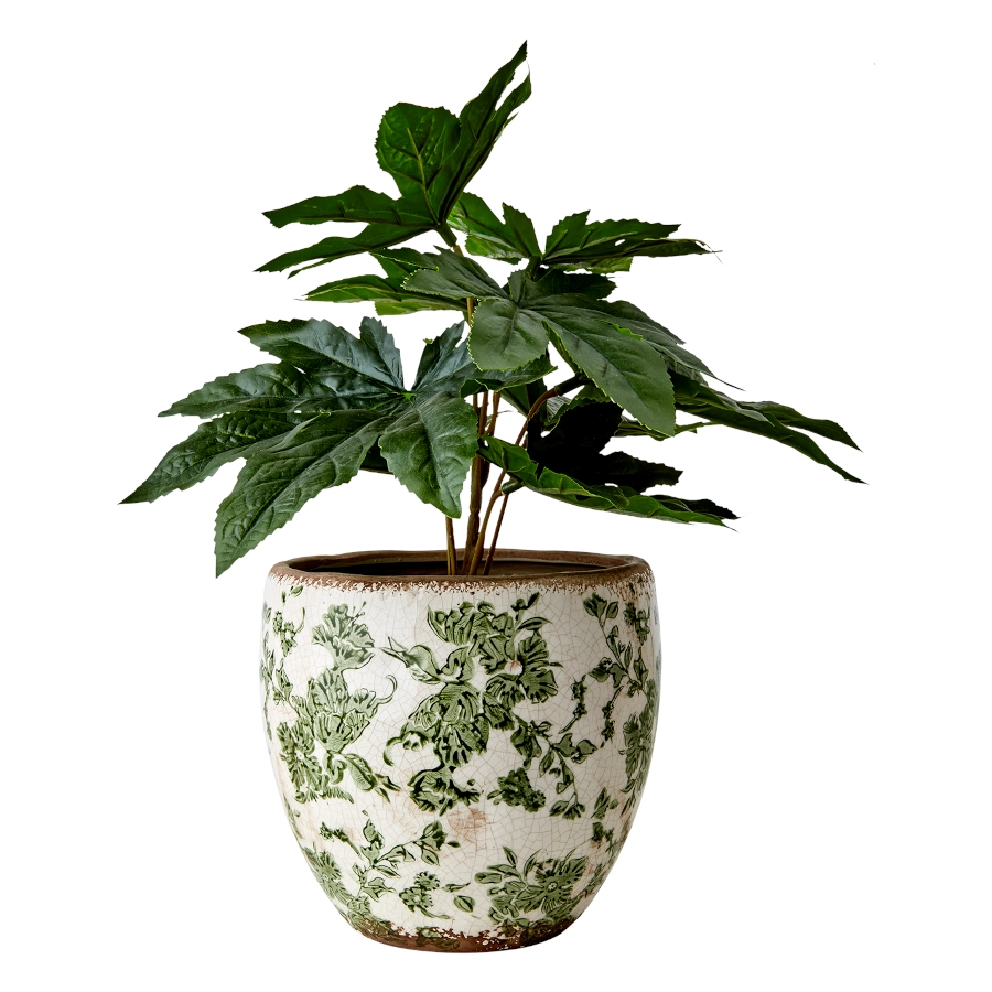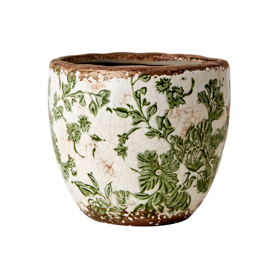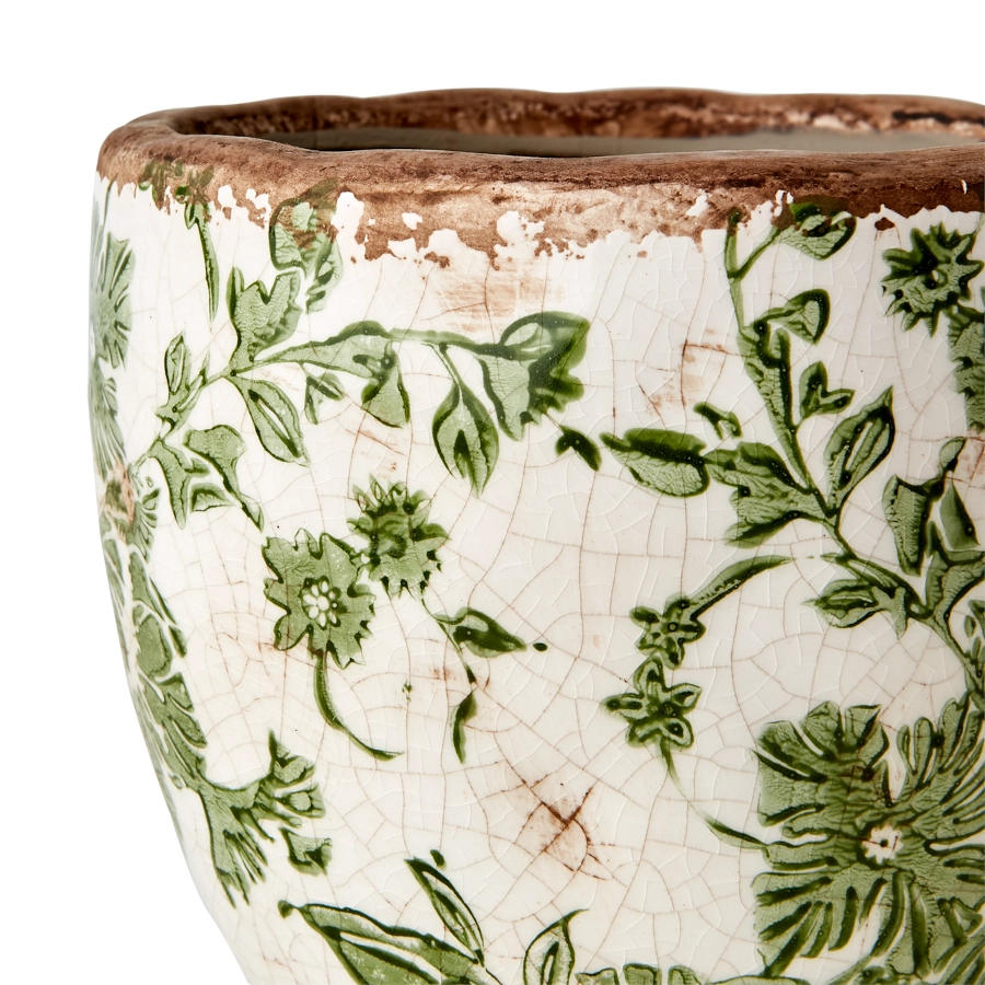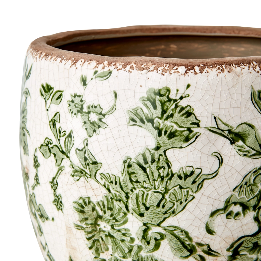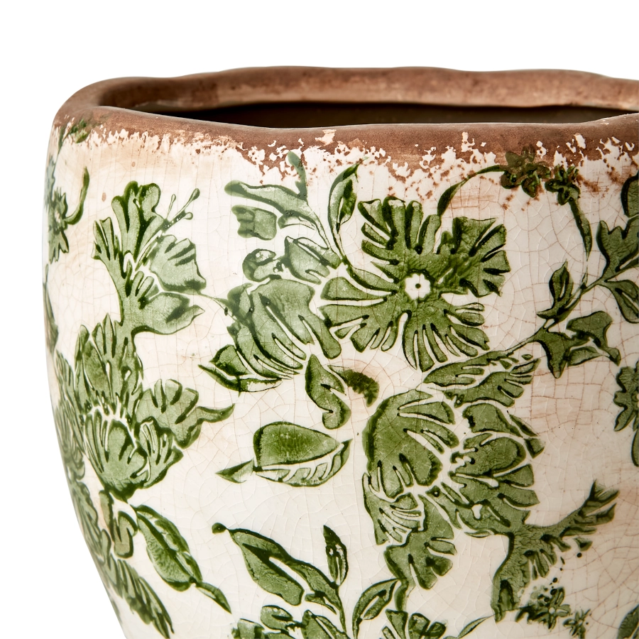 Victoria kruka med rundad form av stengods som har ett vackert mönster med gröna blad och ett rustikt utseende. Krukan ingår även i serien Victoria som är skapad för att ge sin miljö en uppfriskande och naturlig känsla.